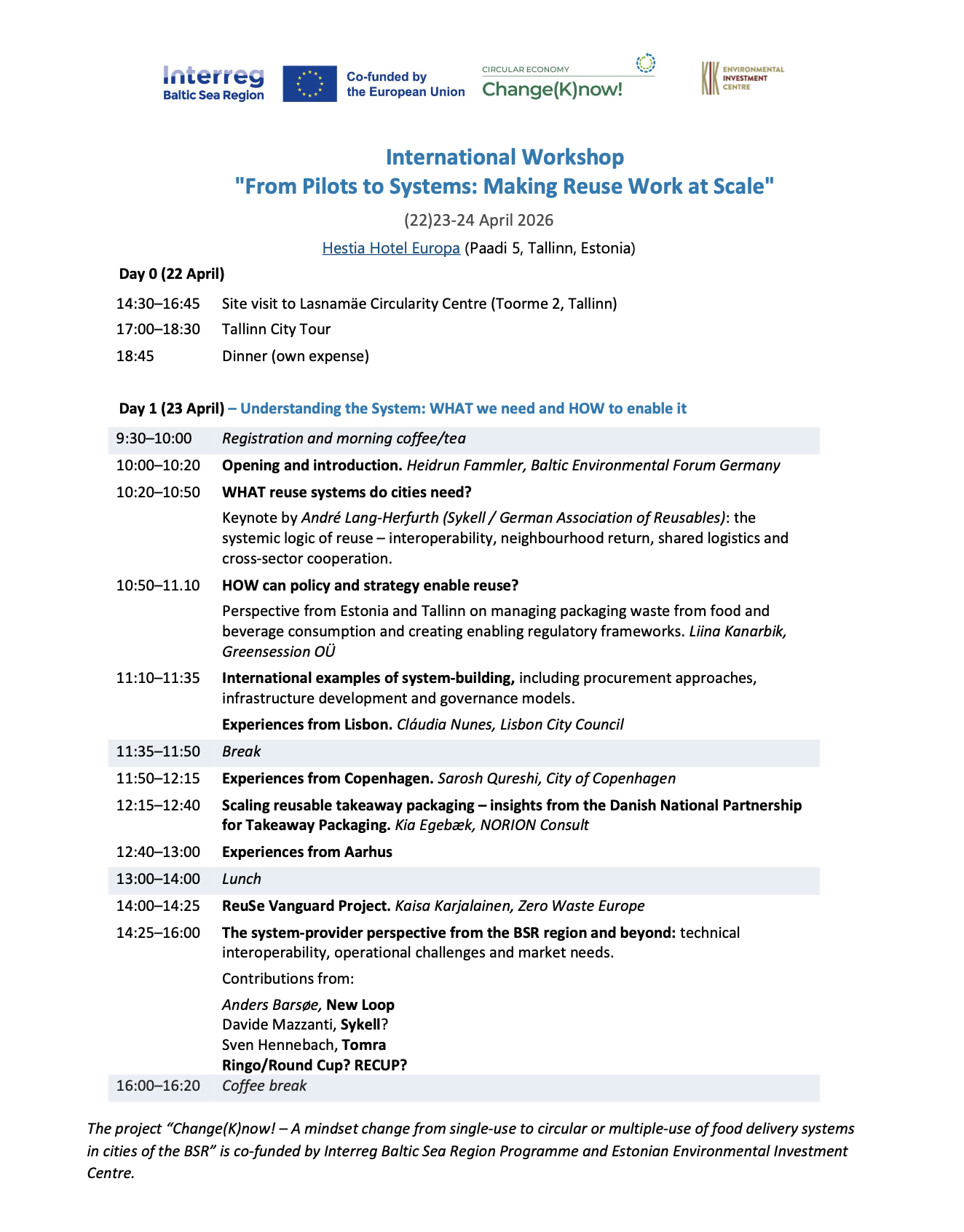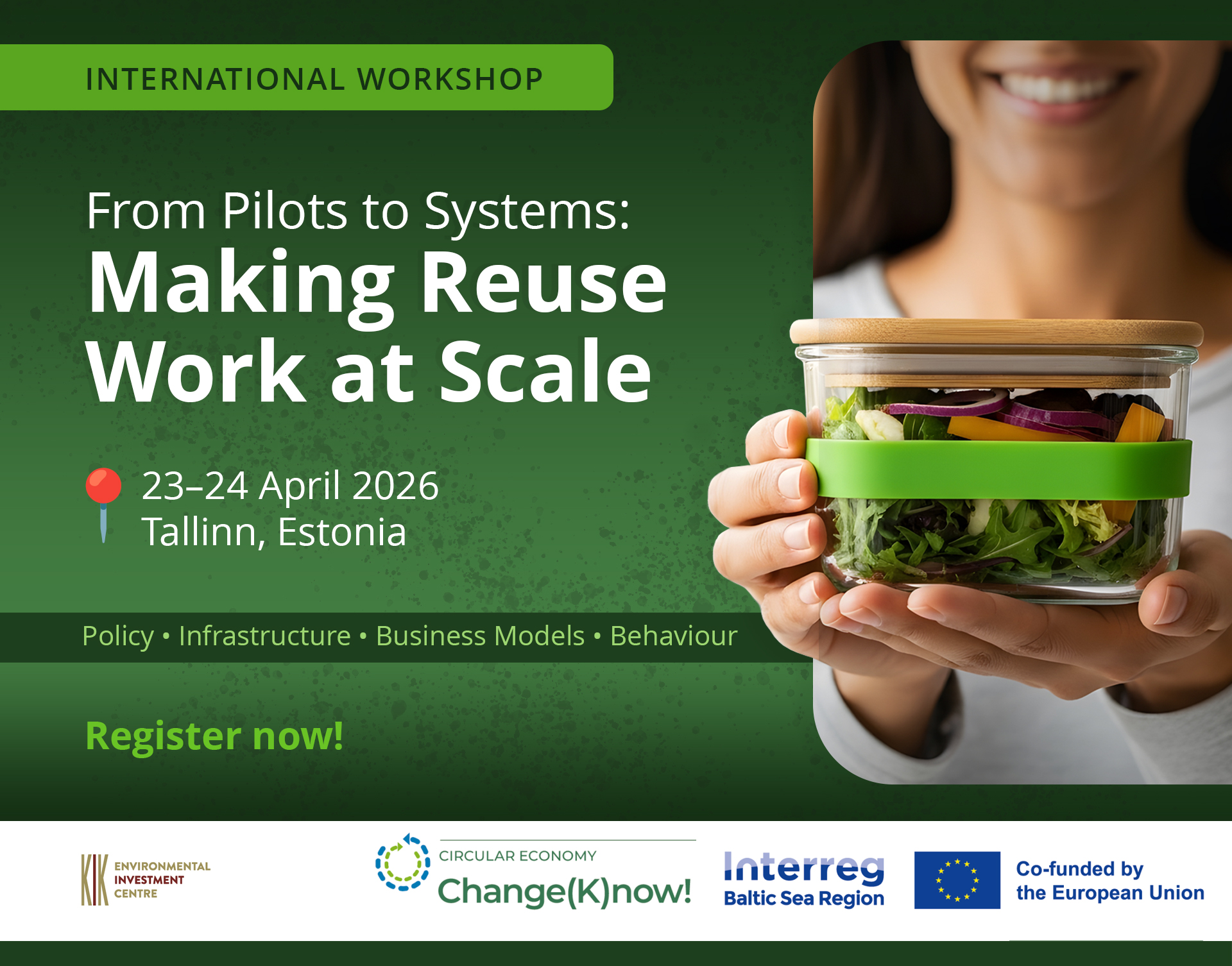 Rahvusvaheline seminar “Pilootprojektidest süsteemideni: kuidas korduskasutus suuremas mastaabis toimima panna”, mis toimub projekti Change(K)now! raames 23.–24. aprillil 2026 Tallinnas.