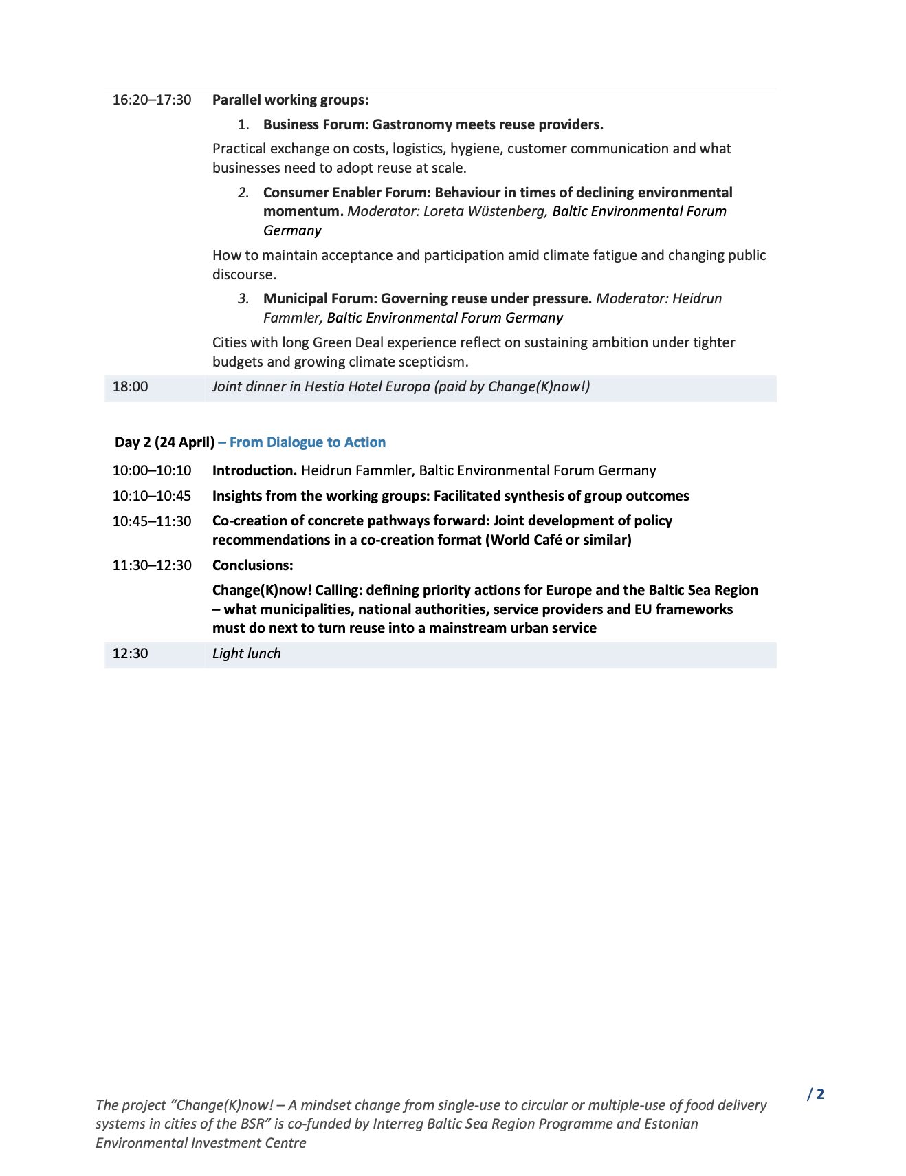 Programm sisaldab rahvusvahelisi näiteid (sealhulgas Kopenhaagen, Aarhus ja Lissabon), korduskasutussüsteemide pakkujate vaatenurki ja interaktiivseid töötubasid ärimudelite, tarbijakäitumise ja omavalitsuse juhtimise teemadel. Teine päev on pühendatud konkreetsete poliitiliste soovituste ühisele väljatöötamisele ja Euroopa ning Läänemere piirkonna järgmiste sammude määratlemisele.